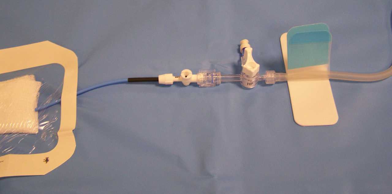 Stick the foam anchoring device to your skin next to the stop cock. Place the tube in the center of the foam anchoring device. Fold the blue tabs up and stick together. The foam anchoring device helps the catheter stay in place. See Figure 4.