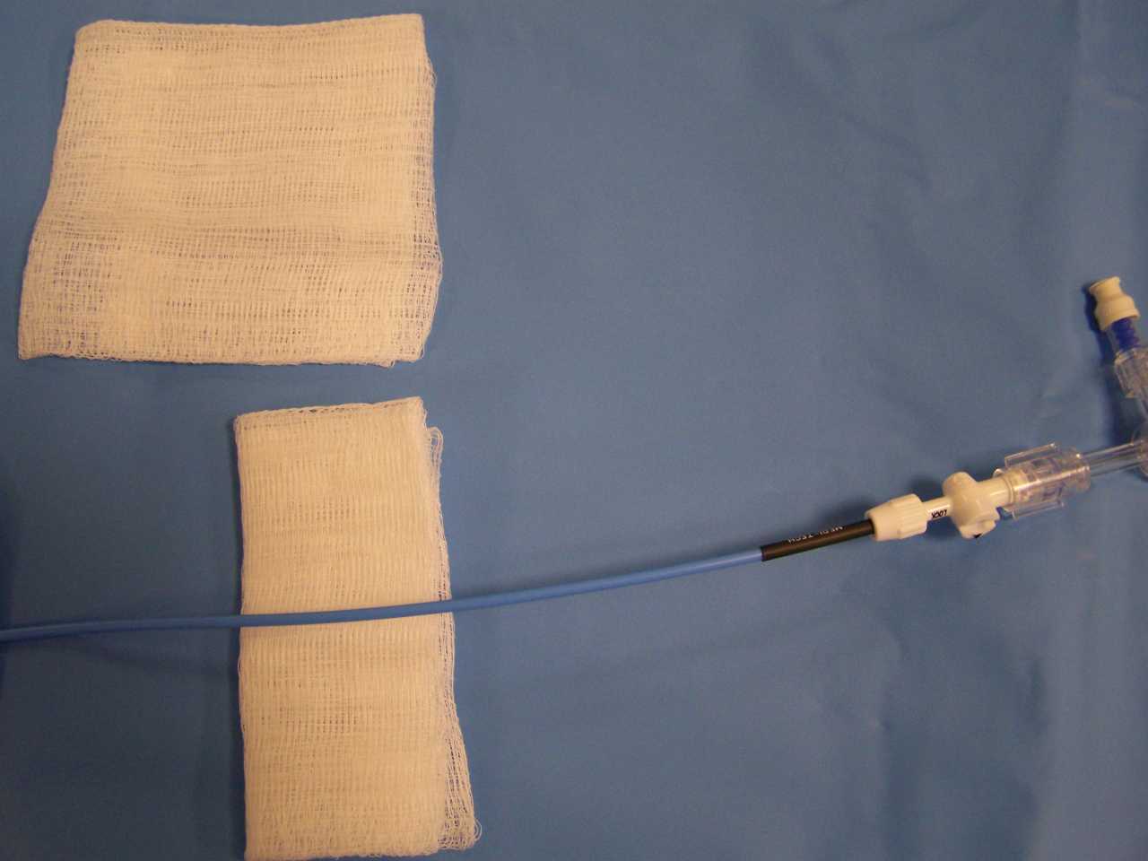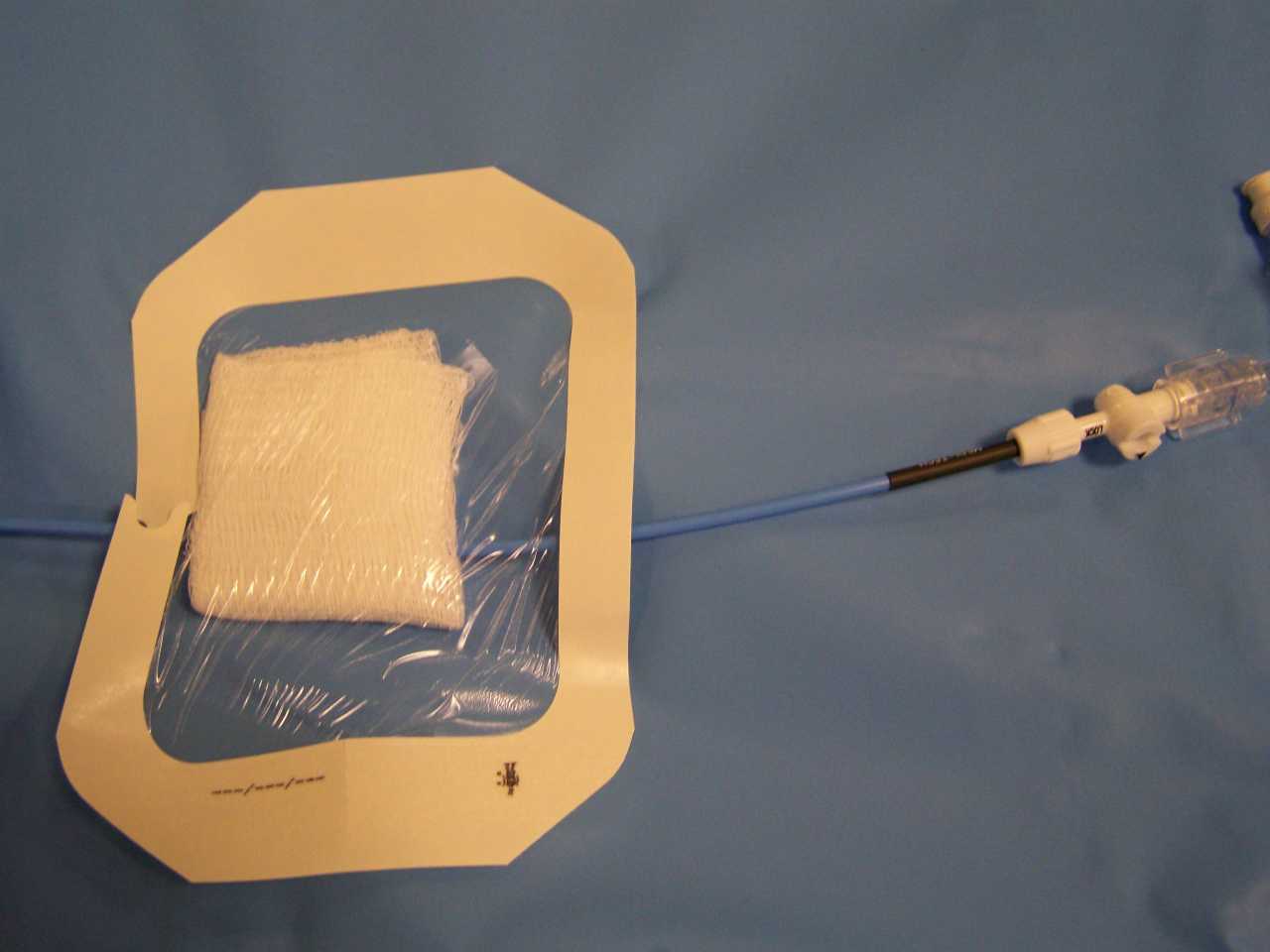 Fold a 4" x 4" gauze pad in half. Slide the gauze under the tube where the catheter enters your body. Fold the gauze over the tube. See Figure 1.