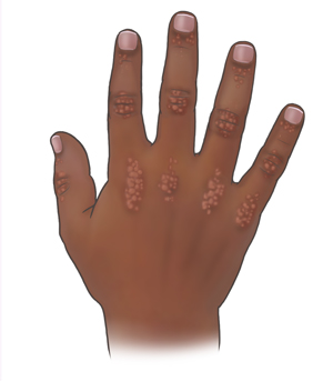 • Hardened deposits under the skin (calcinosis)