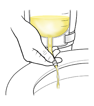 Asegúrese de que la válvula de salida en la parte inferior de la bolsa esté cerrada firmemente antes de conectarla al catéter. Mueva la válvula hacia arriba en dirección a la bolsa hasta que calce con firmeza en su lugar. No tire del tubo. Hágalo con cuidado.